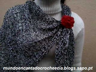 Xale confeccionado em Ponto Segredo sem franjas com uma flor vermelha para acabamento.