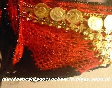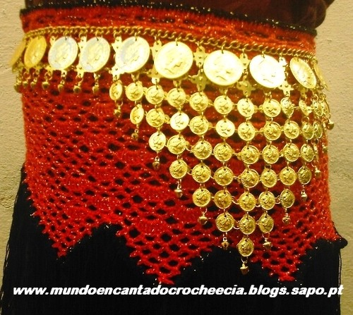 A Dança do Ventre é cheia de magia e encantamento e para deixar as bailarinas ainda mais belas confeccionamos um Lenço de Quadril em linha fio duplo vermelho com fio dourado para a base da peça e linha fio fino preto para a franja.